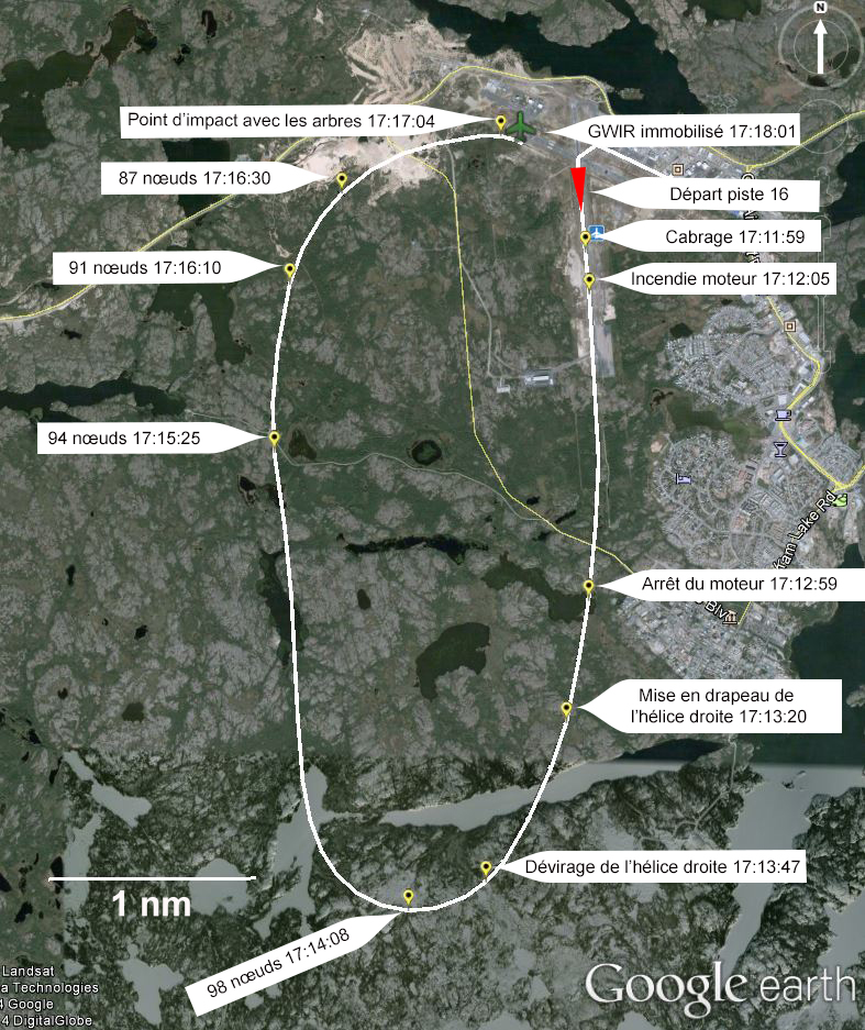 À 17 h 10, le contrôleur de la tour a remarqué un important panache de flammes et de la fumée qui s'échappaient du moteur droit; il a communiqué cette observation à BFL168. Le contrôleur de la tour n'a reçu aucune réponse de BFL168. L'équipage de conduite de BFL168 rentrait le train d'atterrissage lorsqu'il a remarqué un incendie dans le moteur droit. Il a effectué un arrêt d'urgence du moteur, y compris la mise en drapeau de l'hélice droite. Alors que l'hélice droite était en transition vers la mise en drapeau, la manœuvre s'est interrompue avant qu'elle soit complète, et l'hélice s'est remise à tourner en moulinet. BFL168 a ensuite effectué un virage à droite à basse altitude pour tenter de se rendre à la piste 10 (annexe B). Le vol BFL168 a atteint une altitude maximale d'environ 180 pieds au-dessus du niveau du sol (agl)Note de bas de page 2.