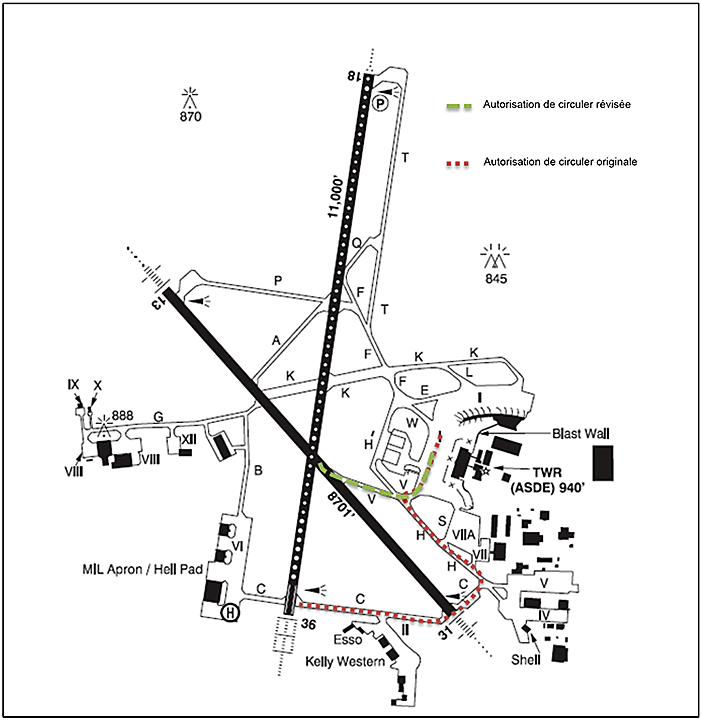 - L'orientation des feux de protection de gauche à un angle de 15 degrés vers l'extérieur de la piste 31, l'orientation des feux de protection de droite par rapport à la position de l'aéronef et l'intensité réduite des feux ont probablement contribué à empêcher les pilotes de repérer le point d'attente.