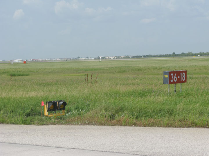 Des panneaux de point d'attente sont également installés aux intersections de 2 pistes ainsi qu'aux intersections d'une voie de circulation et une piste. Ces panneaux indiquent le numéro de la piste dont un aéronef ou un véhicule s'approche. « Des panneaux de point d'attente sont aussi installés à l'intersection de deux pistes quand l'une d'elles est régulièrement utilisée comme voie d'accès à l'autre ou lorsque l'utilisation simultanée de pistes sécantes Note de bas de page 5 est autorisée Note de bas de page 6. » Aux intersections de 2 pistes, les panneaux de point d'attente sont installés de chaque côté de la piste. Des panneaux de point d'attente conformes aux normes en vigueur étaient installés à l'intersection des pistes 31 et 36 (photo 1, photo 2 et photo 3).