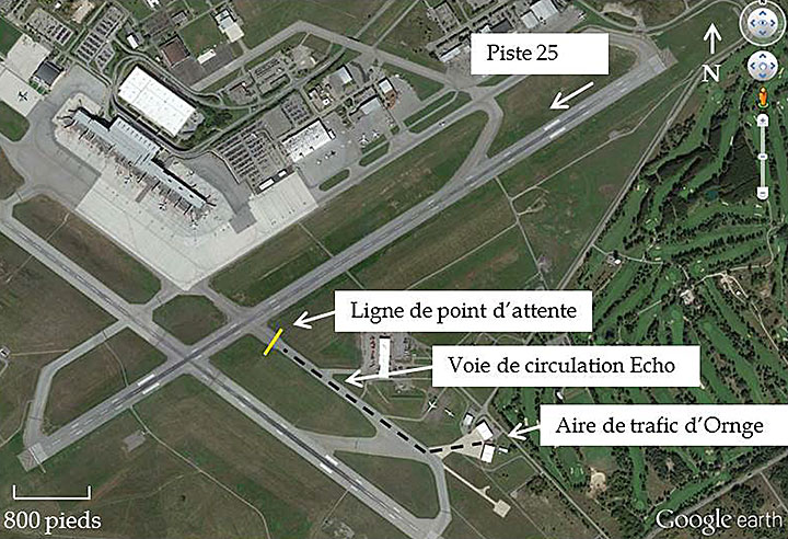 Ayant reçu l'autorisation IFR Note de bas de page 2 du contrôleur chargé des autorisations Note de bas de page 3, LF 4 Medevac a demandé des instructions pour circuler depuis l'aire de trafic où se trouve le hangar d'Ornge Rotor Wing (désigné aux présentes l'aire de trafic Ornge), situé à l'extrémité sud de la voie de circulation Echo (Figure 1). À 8 h 45 min 46 s Note de bas de page 4, LF 4 Medevac a reçu l'instruction de circuler sur la voie de circulation Echo jusqu'à la piste 25, puis de communiquer avec la tour sur la fréquence 118,8 mégahertz et d'attendre à l'écart sur la voie de circulation Echo au sud de la piste 25. Le contrôleur sol Note de bas de page 5 a reçu la relecture correcte de cette communication Note de bas de page 6.