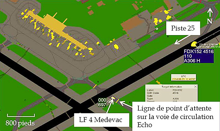 Au moment où LF 4 Medevac a interrompu son roulage, FDX 152 Heavy était déjà au sol et était en pleine course de décélération à une vitesse sol de 110 nœuds, à environ 2600 pieds de l'intersection entre la piste 25 et la voie de circulation Echo (Figure 2). L'écran ASDE montrait que LF 4 Medevac se trouvait au-delà de la ligne de point d'attente sur la voie de circulation Echo. Par contre, l'hélicoptère ne se trouvait pas sur la piste 25; il s'était immobilisé tout juste à côté d'elle. Environ 30 secondes s'étaient écoulées entre le moment où le PNF de LF 4 Medevac avait communiqué avec la tour et le moment où l'hélicoptère a interrompu son roulage.