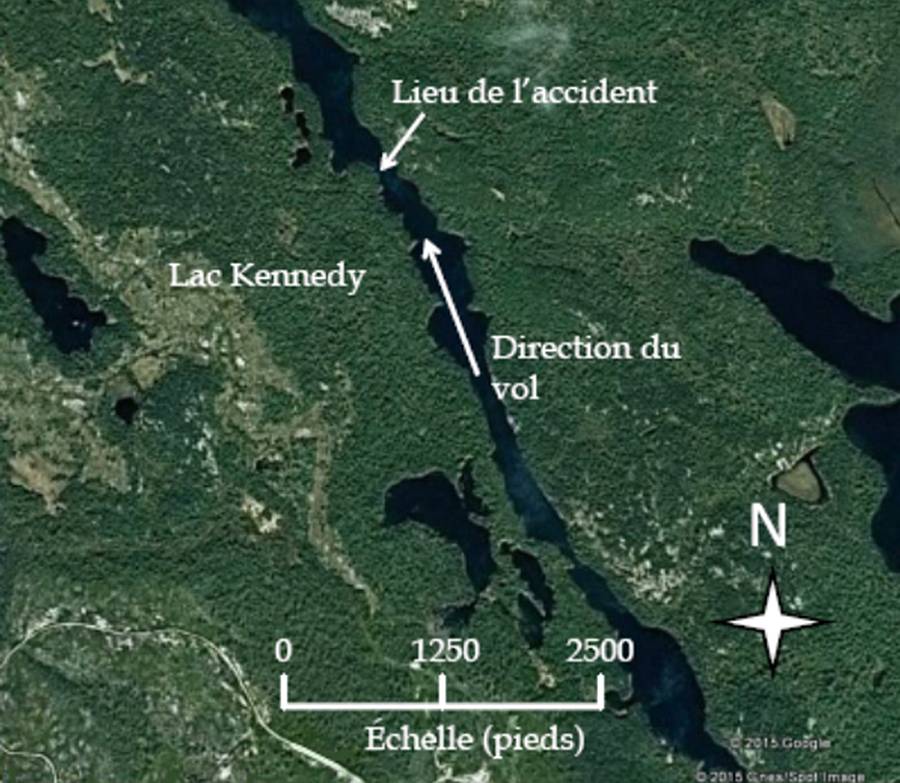 Des conditions météorologiques de vol à vue (VMC) prévalaient au moment de l’accident. Le message d’observation météorologique régulière pour l’aviation (METAR) de 14 h pour Sudbury (Ontario), qui se trouve à environ 40 milles marins au sud du lac Kennedy, était le suivant : température de 20 °C, point de rosée de 8 °C, vents du 020° vrai (V) à 12 nœuds, rafales jusqu’à 19 nœuds sous un ciel généralement nuageux. Il n’y avait aucune précipitation et la visibilité était maximale. Il n’y a aucun centre de veille météorologique près du lac Kennedy. Le pilote a rapporté que les vents étaient variables avec des rafales de l’ouest. Le relief du sol autour du lac peut influer presque instantanément sur la direction et la vitesse des vents, sur le côté du lac au vent. La déclinaison magnétique au lac Kennedy est de 12 degrés ouest.