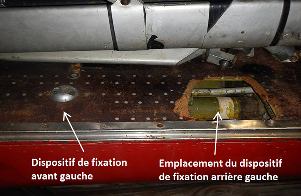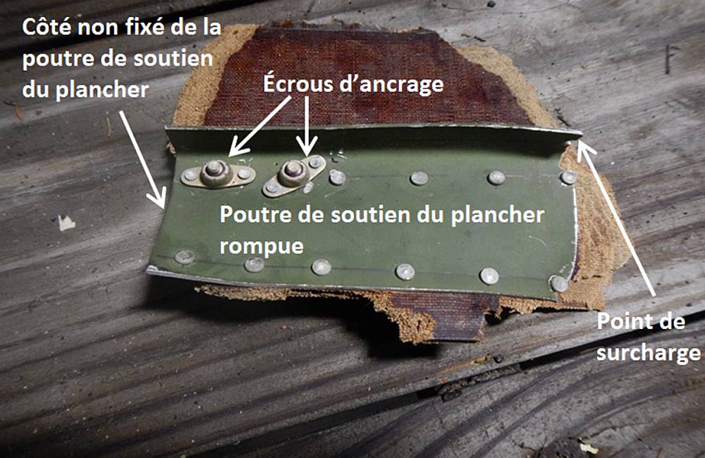 On a examiné la banquette et ses dispositifs de fixation. Il semble que la banquette faisait partie d'un CTS dont a fait l'objet l'aéronef à un certain moment durant sa vie utile. Le côté arrière gauche de la banquette avait été fixé au plancher à l'aide de 2 écrous d'ancrage rattachés à la poutre de soutien du plancher. On a trouvé une section du plancher comprenant les écrous d'ancrage et une partie de la poutre de soutien du plancher qui a cédé (photo 2 et photo 3).