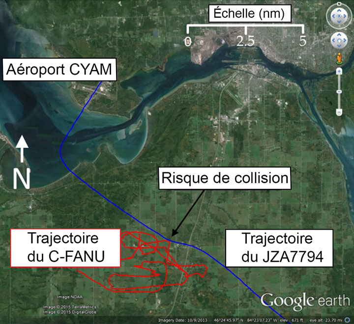 Un aéronef de Havilland DHC-8-102 (immatriculé C-GJMI, numéro de série 077) exploité par Jazz Aviation LP (Jazz) effectuant le vol Jazz 7794 (le JZA7794) a quitté la piste 22 de l’aéroport de Sault Ste. Marie (Ontario) à destination de l’aéroport international Lester B. Pearson à Toronto (Ontario). Alors que l’aéronef franchissait en montée les 4000 pieds d’altitude environ au-dessus du niveau de la mer, l’équipage de conduite de Jazz a reçu une alerte de trafic du système de surveillance du trafic et d’évitement des collisions (TCAS) de l’aéronef, et a aperçu un petit aéronef (immatriculé C-FANU, numéro de série 0681) qui volait à 3 milles devant et à environ 1000 pieds au-dessus. En réponse à l’alerte, le JZA7794 s’est mis en palier à une altitude de 4500 pieds au-dessus du niveau de la mer, mais le C-FANU a amorcé un virage en descente rapide vers lui. L’équipage de conduite de Jazz a effectué une manœuvre d’évitement en inclinant l’aéronef Jazz de 30° à gauche. À 15 h 57, heure avancée de l’Est, le C-FANU est passé du côté tribord du JZA7794, à une distance latérale d’environ 350 à 450 pieds.