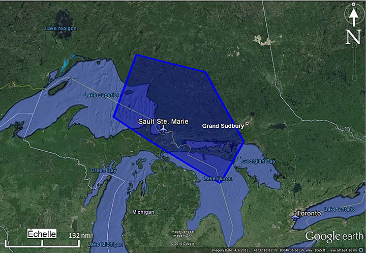 Cette responsabilité est divisée en plusieurs sous-unités étant elles-mêmes sous-divisées en différents secteurs. Le secteur responsable de l'espace aérien où a eu lieu l'événement porte le nom de Sault Low. Ce secteur (figure 2) fait partie de la sous-unité Nord. Il est relativement vaste et couvre une zone d'environ 150 nm sur 235 nm.