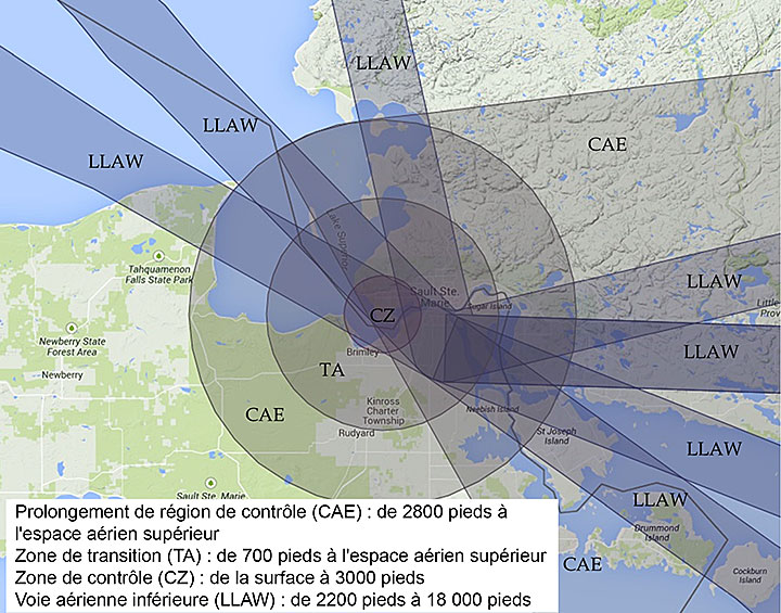 - Il ne faut pas effectuer de vrilles à l'intérieur de la trajectoire de départ/d'approche des aérodromes se trouvant dans la zone environnante (CYAM/KCIU/KANJ/CPC2/CPV3).