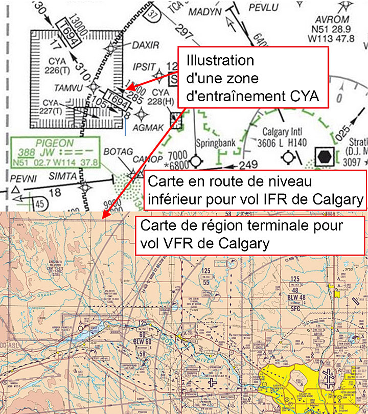 Une autre méthode consiste à déterminer des blocs d'espace aérien désignés comme espace aérien de classe F à statut spécial à service consultatif (CYA). De tels blocs d'espace aérien définis sont désignés comme tels dans le Manuel des espaces aériens désignés et ils sont illustrés tant sur les cartes VFR que sur les cartes IFR (figure 7). Les blocs sont souvent associés de fréquences et d'heures d'exploitation communes, et les unités ATC concernées les connaissent. En règle générale, les contrôleurs des ACC ne feront pas passer un aéronef en mode IFR dans un espace CYA actif.