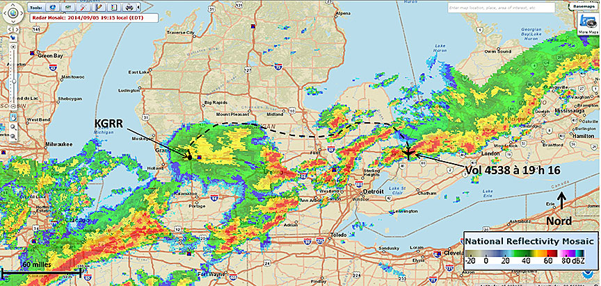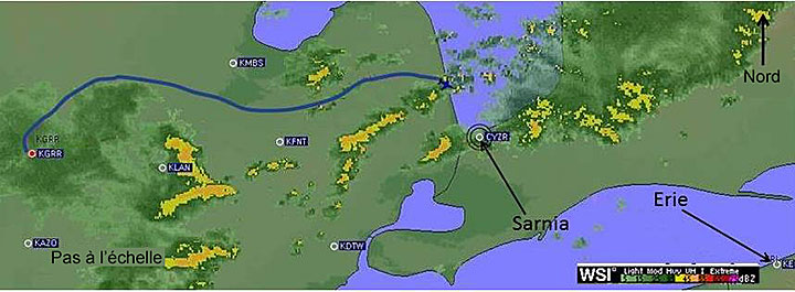 Les données radar obtenues après l'événement indiquaient qu'à 19 h 16, l'aéronef volait vers le sud à travers une ligne d'orages (figure 3).