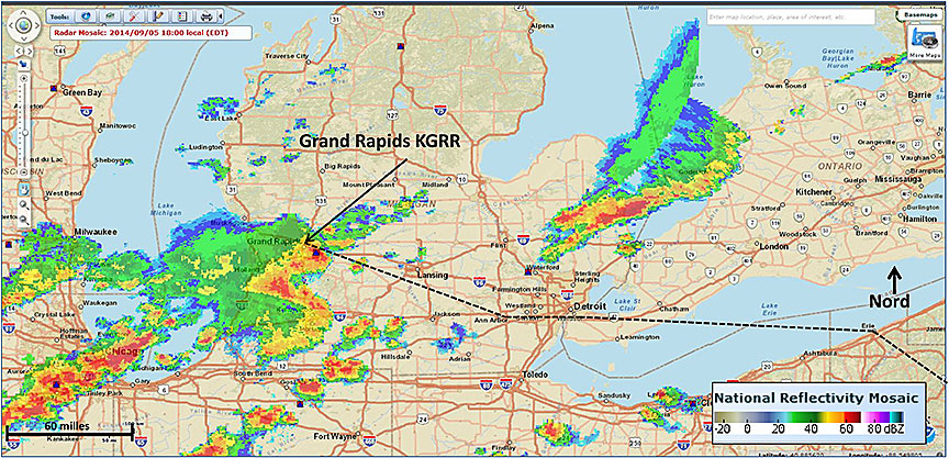 D'après l'imagerie radar d'Environnement Canada, la formation de petites lignes d'orages avait commencé autour de 13 h le long de la vallée de la rivière des Outaouais et s'étendait jusqu'au centre du Michigan. Dès 16 h, une ligne d'orages s'étendait de Wiarton (Ontario) jusqu'au sud du Michigan. Dès 19 h, des lignes de grains s'étaient formées le long du front froid. À 20 h 30, les images radar montraient des taux de précipitations supérieurs à 65 mm/h et des nuages dont les sommets dépassaient 52 000 pieds asl.