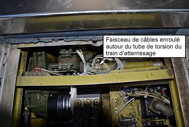 - Pendant la manœuvre de sortie du train d'atterrissage, un faisceau de câbles s'est enroulé autour du tube de torsion rotatif du train, empêchant la sortie complète de ce dernier.