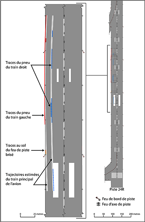L'appareil a endommagé 3 feux de bord de piste de la piste 24R, situés du côté gauche entre 1500 et 2300 pieds du seuil.