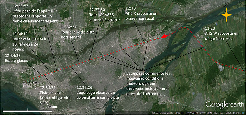 À 12 h 32, alors que l'appareil se trouvait à environ 1900 pieds asl et à 5,5 nm de la piste, le contrôleur de l'aéroport a avisé l'équipage que le vent soufflait du 280 °M à 13 nœuds avec des rafales à 18 nœuds. Il a ensuite autorisé l'appareil à atterrir. Quelques secondes plus tard, il a avisé l'équipage que le balisage lumineux de la piste était hors service. Vers 12 h 33, au moment où il franchissait 1000 pieds agl, l'appareil était en configuration pour l'atterrissage; les volets étaient à la position « FLAPS 3 », le train était sorti, et les déporteurs sol étaient armés. À environ 900 pieds agl, le pilote automatique a été débrayé.