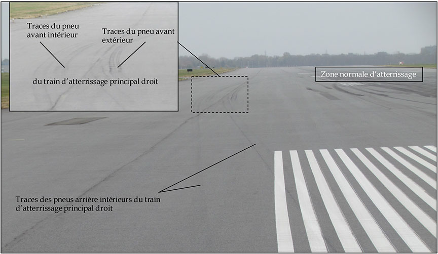 Les pneus arrièreNote de bas de page 4 du train d'atterrissage principal droitNote de bas de page 5 ont touché la piste à quelque 1332 pieds du seuil et à environ 57 pieds à gauche du centre de celle-ci, alors que le pneu gauche du train d'atterrissage gauche se trouvait à 97 pieds du centre de la piste. L'appareil avait un angle de crabe de 8° à droite avec une dérive de 2° à gauche.