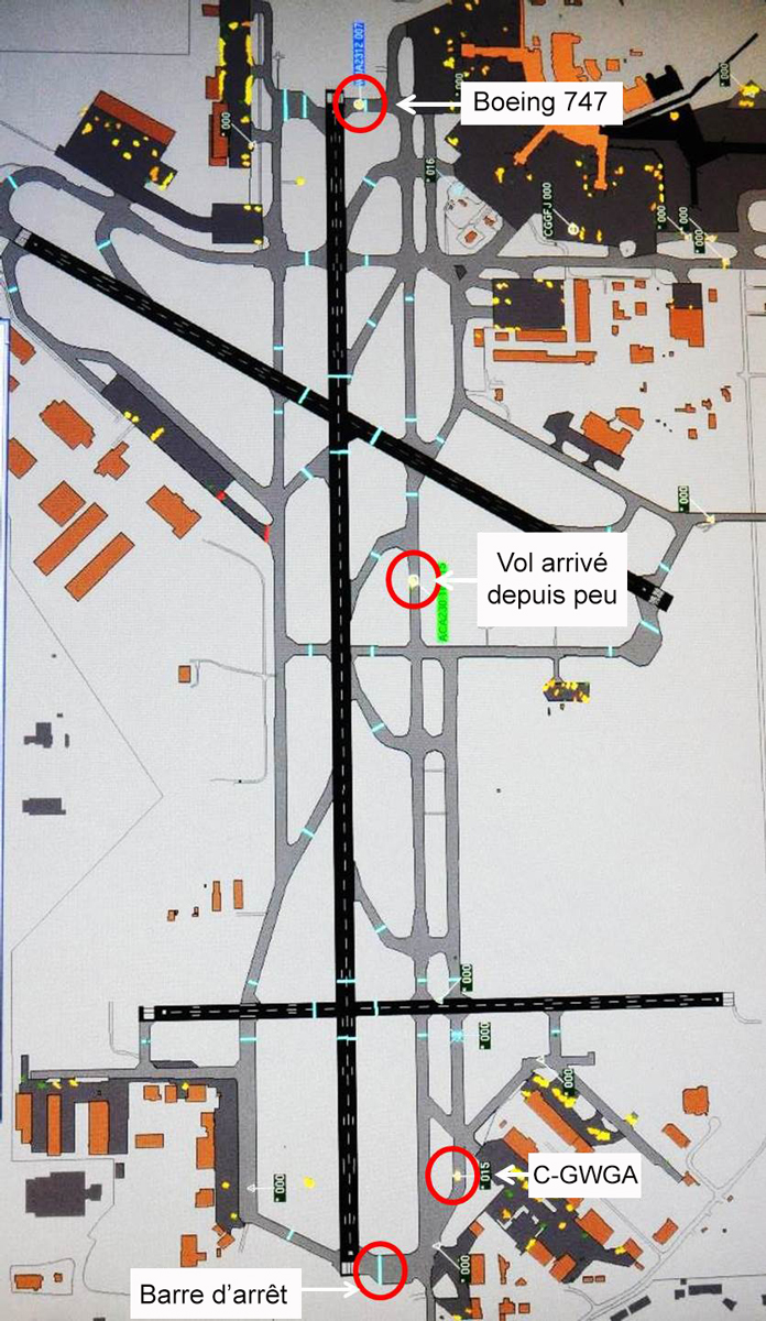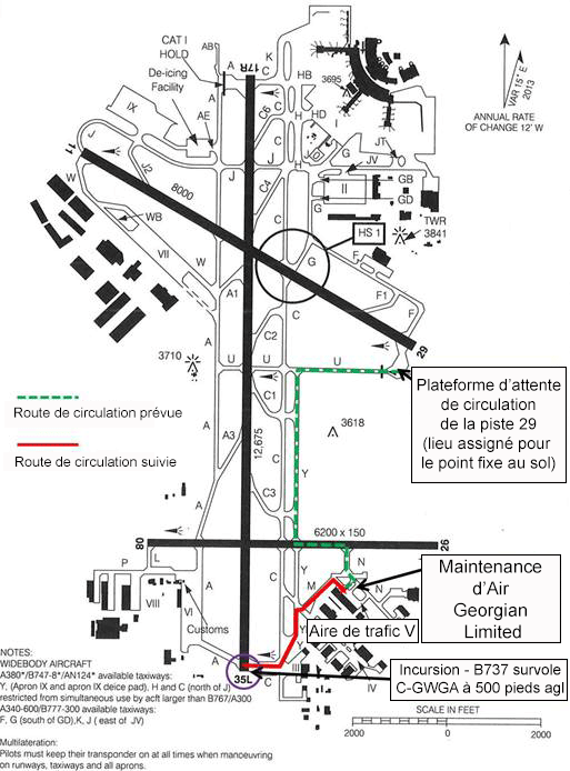 Le C-GWGA a continué de rouler sur la voie de circulation C, puis à 0 h 24 min 10 s, a franchi la ligne d’attente au seuil de la piste 35L tandis que le B737 le survolait, en montée à 500 pieds au-dessus du sol (agl). Le C-GWGA a poursuivi son chemin sur la piste 35L, puis à 0 h 24 min 49 s, un appel a été fait au contrôleur sur la fréquence sol pour lui faire savoir que le C-GWGA se trouvait sur la piste 35L. Le contrôleur a confirmé visuellement que l’aéronef se trouvait sur la piste et lui a immédiatement ordonné de faire demi-tour pour libérer la piste et se rendre sur la voie de circulation C pour attendre à l’écart de la piste 26. Le C-GWGA a ensuite roulé jusqu’à la plateforme d’attente de circulation de la piste 29; le point fixe au sol a été fait, puis l’aéronef est retourné à l’aire de trafic V sans autre incident.