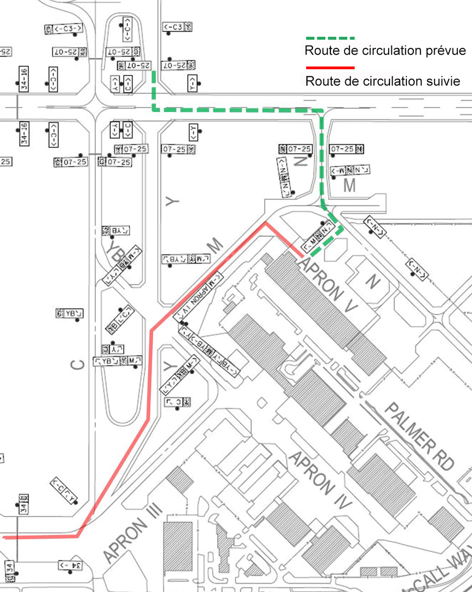 Le C-GWGA est sorti de l’aire de trafic V par le nord, puis a viré à gauche sur la voie de circulation M pour se diriger vers l’ouest. Il a ensuite poursuivi son chemin de la voie de circulation M à la voie de circulation Y, puis a viré à gauche pour se diriger vers le sud en direction de la voie de circulation C. À 0 h 22 min 12 s, l’équipage d’un Boeing 737-700 (B737) a appelé le contrôleur de la tour pour demander l’autorisation de décoller de la piste 17R. Le contrôleur a balayé la piste des yeux du sud au nord, puis a confirmé son information visuelle en regardant l’affichage du radar de surveillance des mouvements de surface (ASDE) du nord au sud (annexe B). Le contrôleur a remarqué une cible primaire sur la voie de circulation Y, près de l’intersection avec la voie de circulation M, mais a conclu qu’il s’agissait d’un véhicule se dirigeant vers le chemin d’accès passant au sud du seuil de la piste 35L. À 0 h 22 min 22 s, le contrôleur a autorisé le B737 à décoller de la piste 17R.