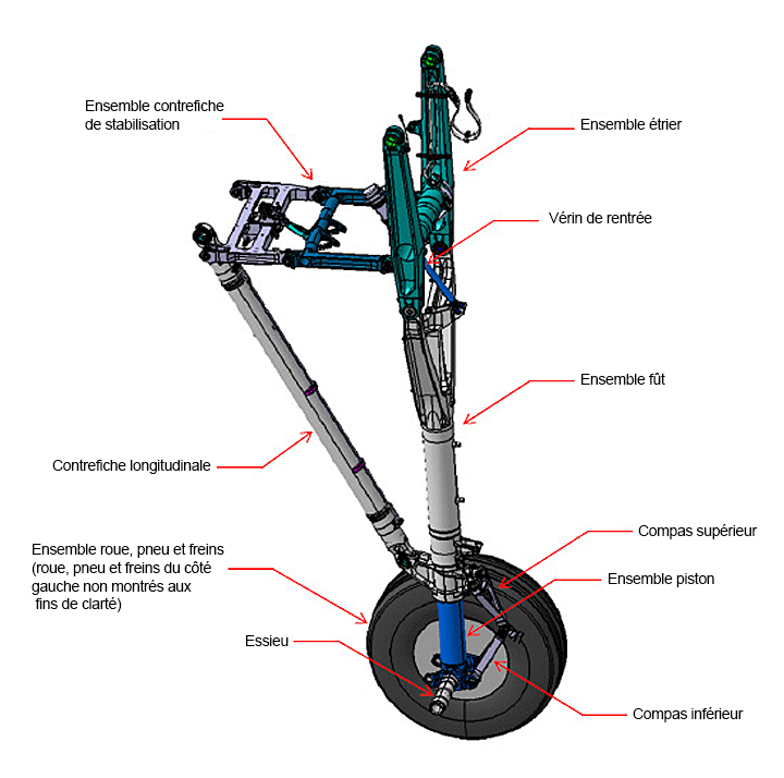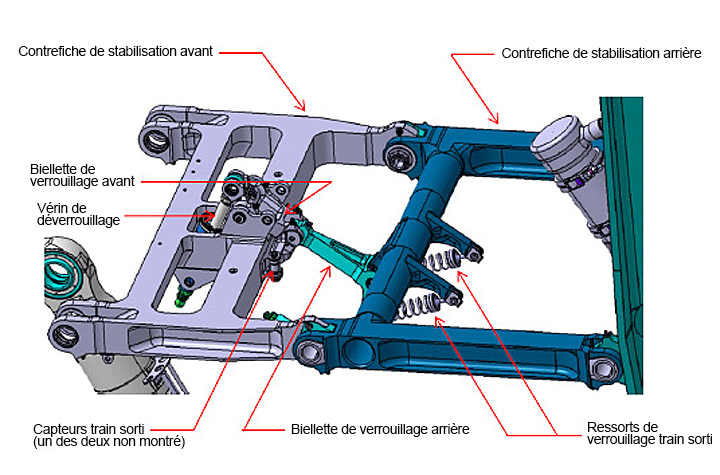 - Les contrefiches avant et arrière, qui sont les 2 plus gros composants de l'ensemble. Lorsque le train d'atterrissage principal est sorti et verrouillé, ces 2 composants sont maintenus en position de léger arc-boutement par l'ensemble des biellettes de verrouillage, ce qui stabilise le train d'atterrissage (qui est un mécanisme à part entière).