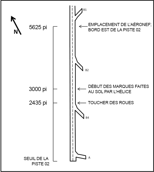 L'aéronef s'est posé légèrement à la droite de l'axe médian de la piste 02, à 2435 pieds du seuil de celle-ci. L'aéronef a conservé le cap de piste pendant toute la phase d'atterrissage, au moment de l'effondrement du train et pendant la glissade subséquente. Il s'est immobilisé 3190 pieds après avoir touché le sol. Les roues du train principal gauche étaient toujours sur la piste. Le côté gauche du fuselage reposait sur le bord droit de la surface asphaltée de la piste et était toujours parallèle à celle-ci. L'aile droite touchait le sol. Le train avant s'était effondré vers l'arrière pendant la glissade et se trouvait à environ 5 pieds du bord droit de la surface asphaltée de la piste.