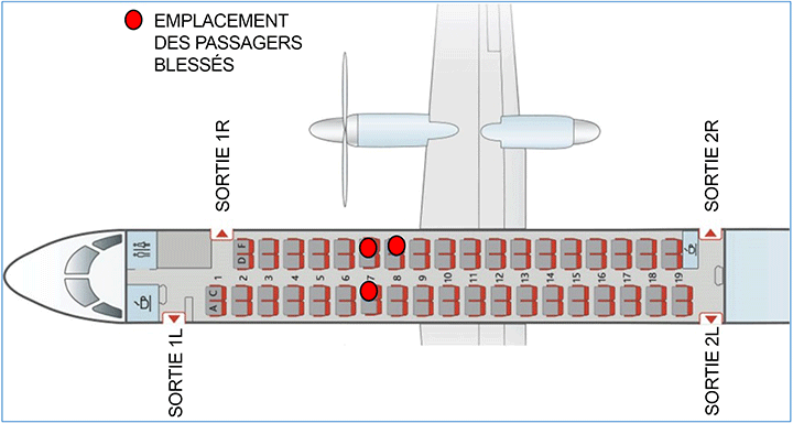 Les passagers prenant place dans les sièges 7F, 8F et 7C ont été blessés lorsqu'une partie d'une pale de l'hélice a percé le fuselage (figure 2); ils ont été blessés par des morceaux de plastique garnissant l'intérieur de la cabine (paroi murale, hublot, etc.) qui ont été projetés dans la section sièges. Les passagers ont également subi des traumatismes contondants, des abrasions et des plaies mineures par perforation. Personne n'a été blessé pendant l'évacuation.