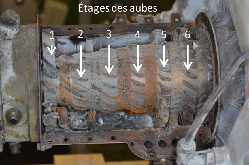 Cette progression des dommages laisse croire que la défaillance initiale est survenue dans les aubes de 2e étage du compresseur ou dans les aubes de 2e étage du stator. Les aubes de 2e étage du compresseur étaient complètement détruites, mais il n'y avait aucun dommage en amont. Il est donc probable que la défaillance d'une aube de 2e étage du compresseur ait provoqué la perte de puissance.