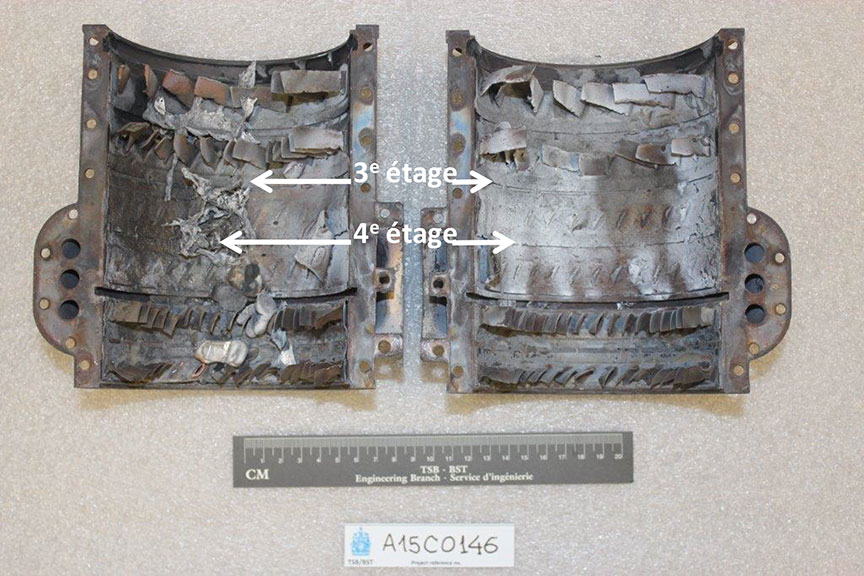Les dommages secondaires à l'ensemble compresseur et les fragments d'aubes retrouvés en aval de la section compresseur laissent croire que le moteur fonctionnait toujours peu de temps après la panne initiale du compresseur. L'absence de dommages aux entretoises de soutien avant ou aux aubes de 1er étage du compresseur laisse croire que le moteur n'a pas ingéré de corps étranger. Les dommages au compresseur commencent au niveau des aubes de 2e étage. En tenant compte de l'écoulement de l'air durant le fonctionnement du compresseur, les dommages progresseraient vers l'aval depuis le point de la défaillance initiale.