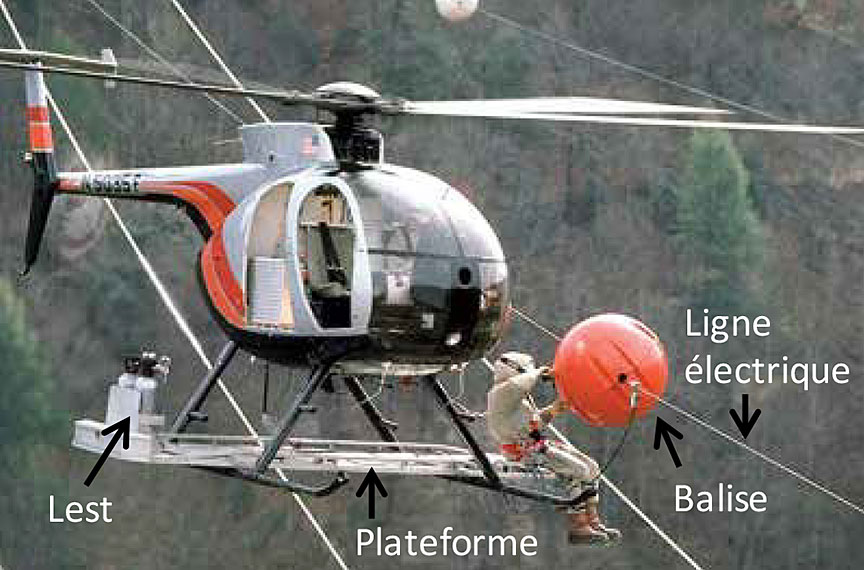 L'installation des balises sphériques se fait par hélicoptère lorsque le relief ou la hauteur des lignes électriques ne permettent pas l'utilisation d'équipement au sol. L'hélicoptère est muni d'une plateforme de travail externe montée sur les patins du train d'atterrissage. Le lignard s'assoit sur la plateforme et s'attache à l'aide d'une ceinture de sécurité et d'un câble d'attache. Le lignard tient la balise sur ses genoux au décollage. L'hélicoptère s'approche ensuite de la ligne électrique pour permettre au lignard d'installer la balise (photo 1). Des contrepoids à l'autre bout de la plateforme externe contrebalancent le poids du lignard et assurent la stabilité latérale de l'hélicoptère.