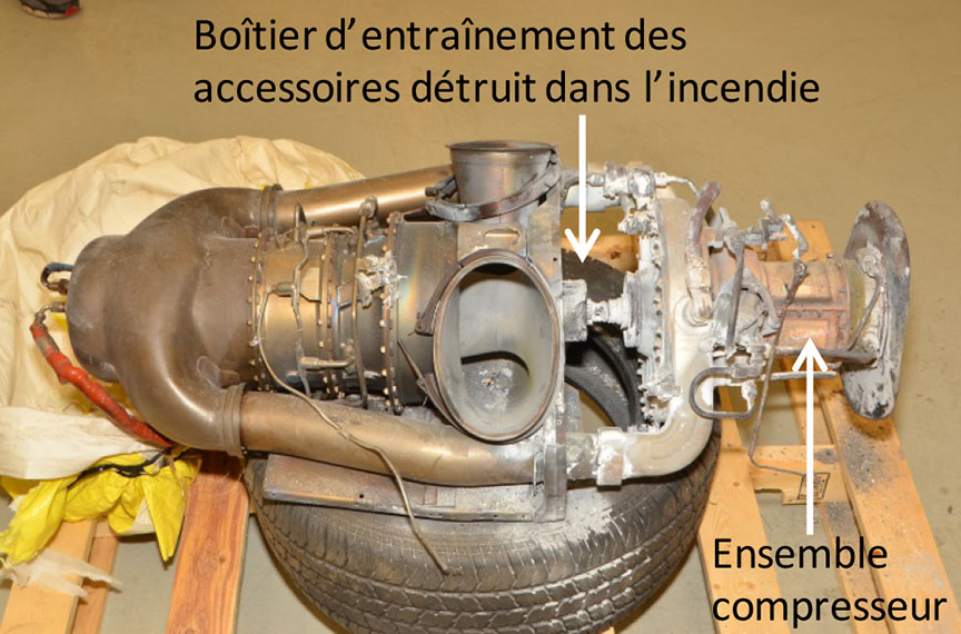 Une inspection du moteur a permis de constater que l'incendie qui s'est déclaré après l'impact avait entièrement consumé le boîtier d'entraînement des accessoires. On a pu récupérer le reste du moteur, qui a été transporté aux installations régionales d'examen des épaves du BST aux fins d'analyses plus approfondies.