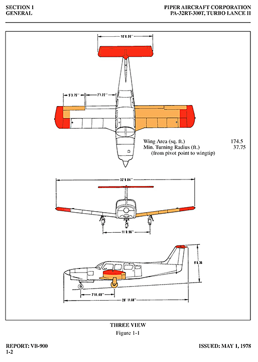 Le Piper PA-32RT-300T est un avion monomoteur non pressurisé. Il comporte 2 espaces réservés aux bagages : un situé derrière le moteur, et l'autre situé derrière les sièges arrière. Ces 2 espaces portaient une plaque indiquant que la capacité de charge maximale était de 100 livres.