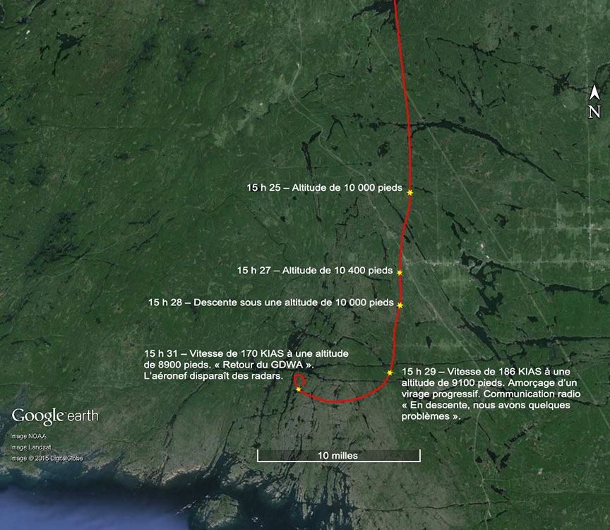 À 15 h 25, le pilote a communiqué avec le Centre de contrôle régional de Toronto (Centre de Toronto), a indiqué que l'aéronef se trouvait à une altitude de 10 000 pieds asl, et a demandé un calage altimétrique. L'aéronef a atteint une vitesse moyenne de 130 KIAS, et le cap a légèrement dévié vers la gauche et la droite.
