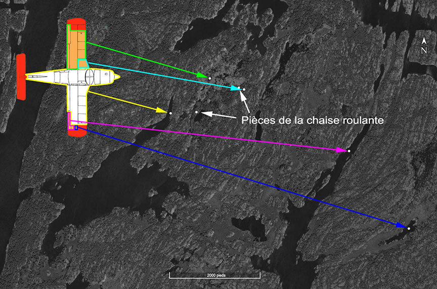 L'aéronef s'est désintégré en vol, et la partie principale du fuselage a percuté le sol, près du sommet d'une paroi rocheuse escarpée, à une vingtaine de pieds au-dessus de la surface gelée de la rivière des Français. Il a alors dévalé la paroi rocheuse, puis s'est immobilisé sur la glace. L'épave a été consumée en grande partie par un violent incendie après impact. Sur le moteur et l'hélice endommagés par les flammes, rien n'indiquait qu'une condition antérieure à l'accident aurait pu empêcher l'aéronef de fonctionner normalement. L'incendie avait aussi provoqué la fonte d'une partie de la glace, créant un plan d'eau; quelques petites pièces de l'épave ont donc coulé.
