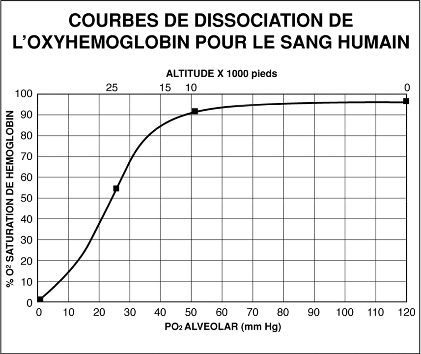 La courbe de dissociation de l'oxyhémoglobine (figure 2) montre que la saturation en oxygène de l'hémoglobine baisse considérablement et rapidement au-dessus de 10 000 pieds (3000 mètres) asl. Les personnes dont la PaO2 est réduite, même au sol, à cause d'une maladie, et qui sont exposées à une réduction supplémentaire de la pression cabine à haute altitude peuvent se trouver au bas de la courbe de dissociation de l'oxyhémoglobine. Elles peuvent alors avoir une très faible saturation en oxygène de l'hémoglobine, ce qui provoquerait une détresse médicale et aggraverait leur maladie sous-jacenteNote de bas de page 21.
