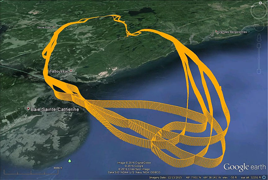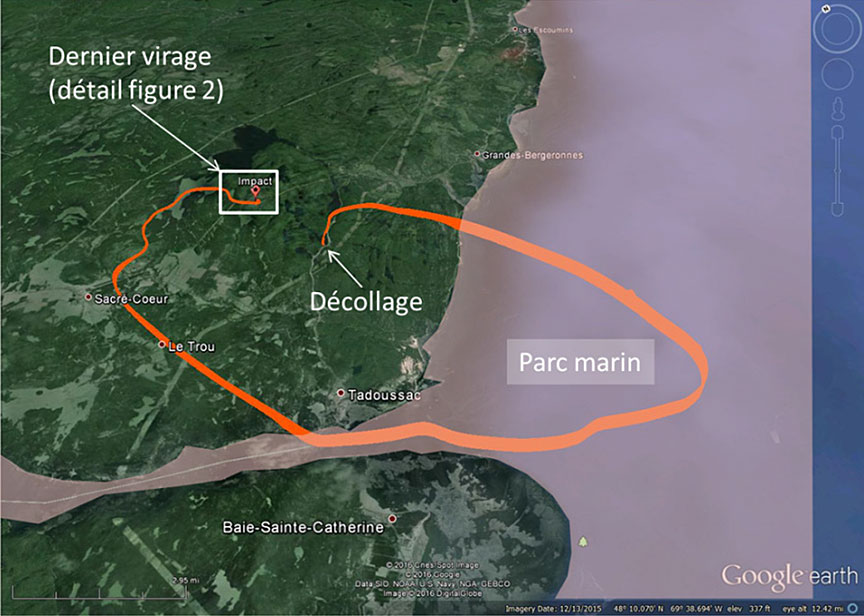 Après le décollage, le C-FKRJ est monté à 2000 pieds au-dessus du niveau de la mer (ASL), puis s'est dirigé vers le sud au-dessus du parc marin du Saguenay–Saint-LaurentNote de bas de page 3, qu'il a survolé entre 11 h 7 et 11 h 16. Par la suite, il est passé au-dessus de l'embouchure du fjord du Saguenay, puis a bifurqué vers le nord et a quitté la zone restreinte du parc marin (figure 1).