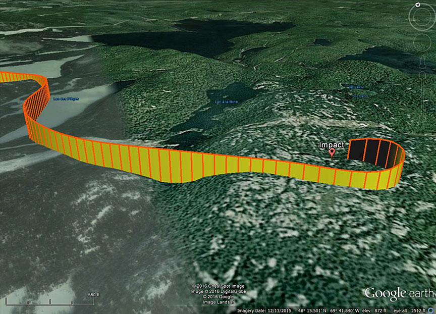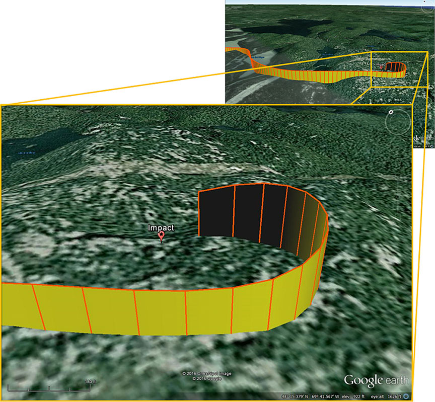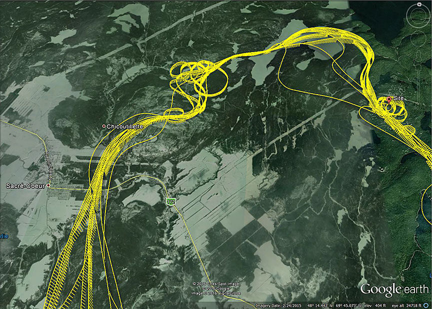 À ce moment, le C-FKRJ est descendu à une altitude d'environ 1100 pieds ASL en s'approchant des collines dont les sommets culminent à plus ou moins 1000 pieds ASL. Juste au sud du village de Sacré-Cœur (Québec), l'appareil a viré vers le nord-est et est passé au-dessus des collines à quelque 100 pieds au-dessus du sol (AGL) avant de retourner vers le lac Long. Alors que l'appareil passait le sommet d'une colline à environ 110 pieds AGL, le pilote a amorcé un virage à gauche à grande inclinaison. À mi-virage, le C-FKRJ a subi un décrochage aérodynamique menant à une autorotation de mise en vrille et, à 11 h 27, en descente verticale, il a percuté un affleurement rocheux sur le sommet d'une colline aux coordonnées 48°15.405′ N et 069°41.597′ O (figure 2).