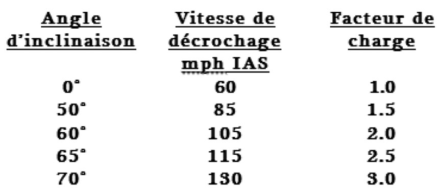 Le manuel de vol du DHC-2 indique par ailleurs que dans un virage à grande inclinaison, le facteur de charge peut atteindre la charge limite et augmenter le risque d'un décrochage inopiné. Par conséquent, le manuel présente un tableau fournissant la vitesse de décrochage et le facteur de charge correspondant selon l'angle d'inclinaison latérale de l'appareil (figure 5).
