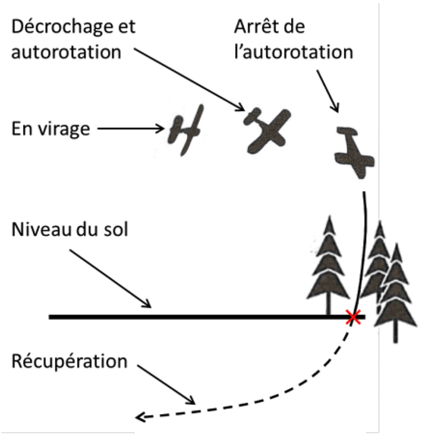 - Lorsque le pilote a effectué un virage à gauche à grande inclinaison, un décrochage aérodynamique s'est produit, provoquant une mise en vrille à une altitude insuffisante pour permettre une reprise de la maîtrise de l'appareil avant l'impact à la verticale avec le sol.