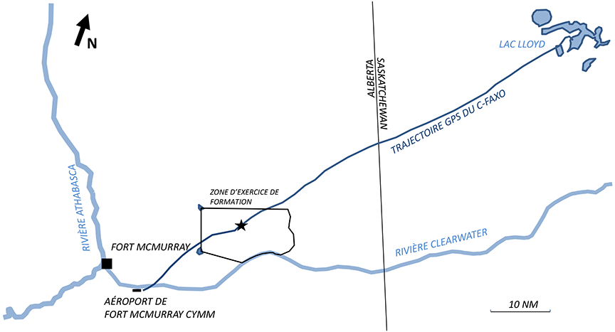 À 18 h 43, le pilote, seul à bord du C-FAXO (FAXO), a décollé du lac Lloyd (Saskatchewan), puis a fait route directement vers CYMM, montant à une altitude de 4400 pieds au-dessus du niveau de la mer (asl). Du lac Lloyd à CYMM, il y a environ 82 nm en route directe. À 18 h 49 min 11 s, le FAXO est apparu sur le radar à 77 nm au nord-est (45°) de CYMM, franchissant les 3600 pieds asl en montée à une vitesse-sol de 130 nœuds. À 19 h 15 min 21 s, le FAXO est entré dans la zone d'exercice par l'angle nord-est, et ce, en descente depuis une altitude de 4000 pieds asl (figure 1).