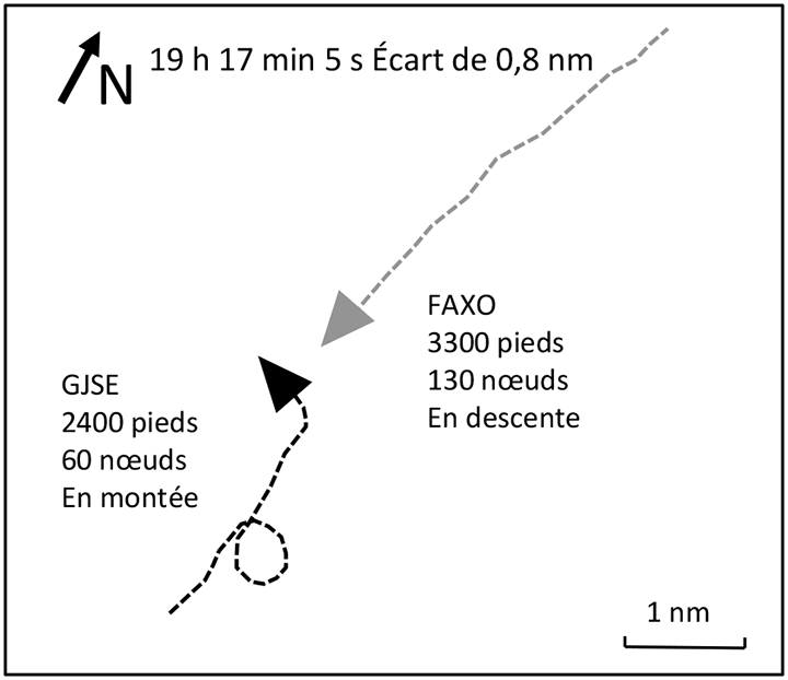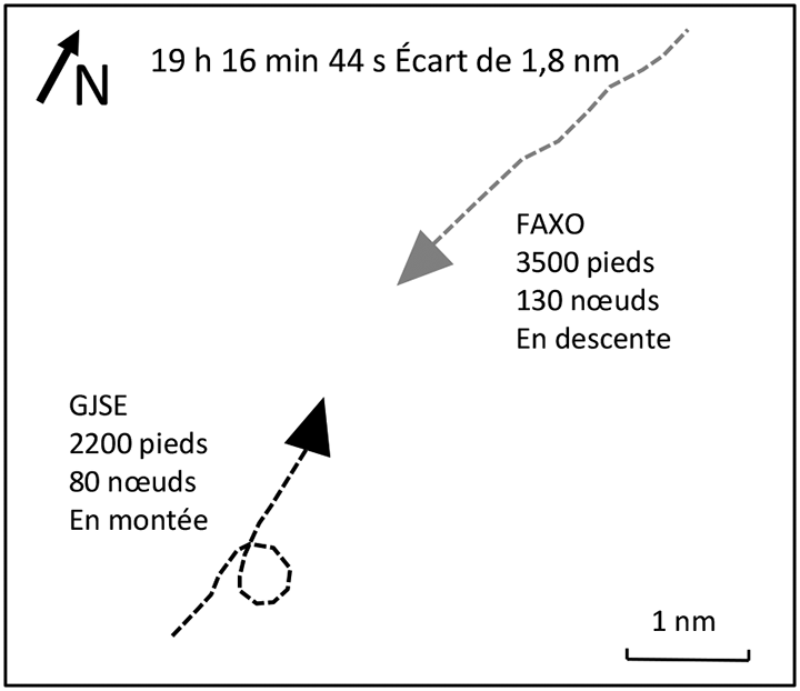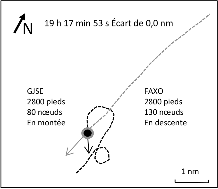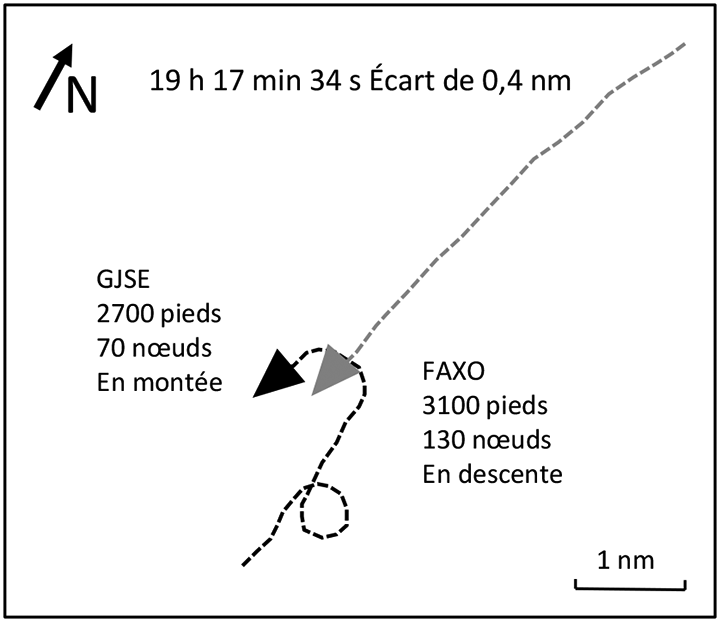 La troisième à 19 h 17 min 34 s, alors que le GJSE faisait cap au sud-ouest sur une trajectoire parallèle à celle du FAXO, décalé de 0,37 nm vers la droite et 200 pieds plus bas. Le FAXO dépassait le GJSE par l'arrière en raison de la différence de vitesse de 60 nœuds. Étant donné que le GJSE est un aéronef à voilure haute, son aile gauche a sans doute empêché l'instructeur de voir l'aéronef qui approchait. Cette obstruction visuelle s'est probablement maintenue pendant le virage en montée vers la gauche croisant la trajectoire du FAXO jusqu'à la collision à 19 h 17 min 53 s.