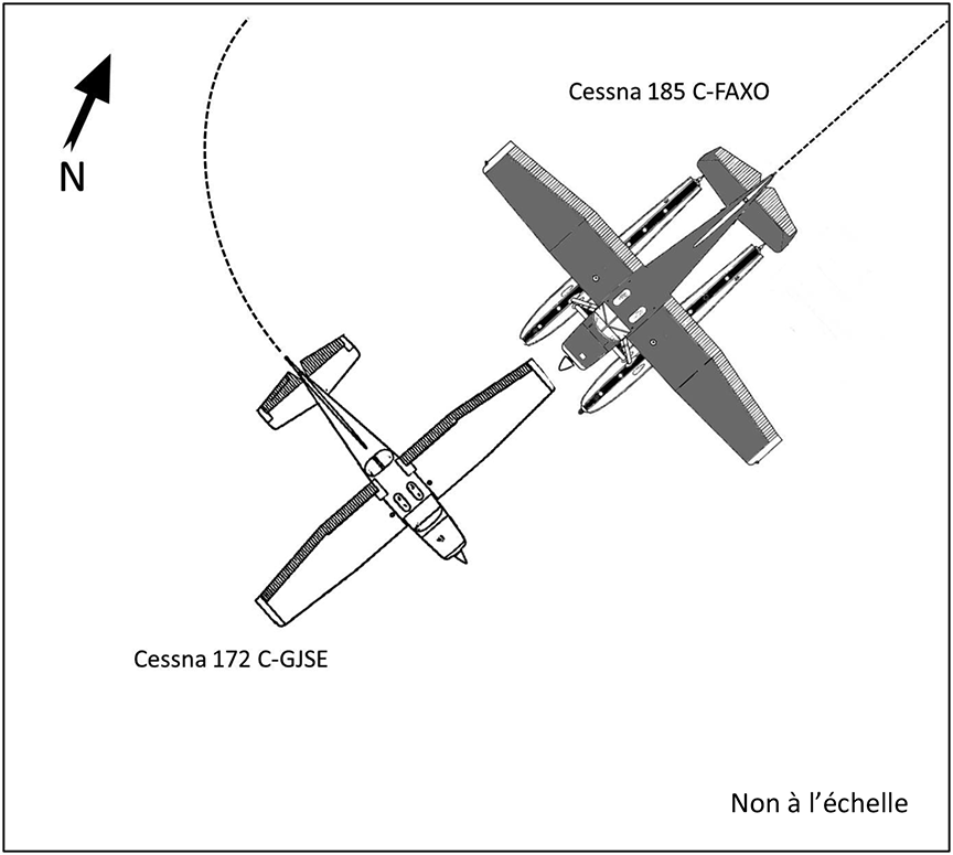 L'aéronef Cessna 172P (immatriculé C-GJSE, numéro de série 17274696) de W.M.K. Holdings Ltd. (ci-après appelée McMurray Aviation) effectuait un vol de formation de jour selon les règles de vol à vue dans la zone d'exercice située au nord-est de l'aéroport Fort McMurray (CYMM) (Alberta). Conformément à son plan de vol, un aéronef Cessna A185E sous immatriculation privée muni de flotteurs amphibies (immatriculé C-FAXO, numéro de série 18501737) en provenance du lac Lloyd (Saskatchewan) se dirigeait vers CYMM. À 19 h 17, heure avancée des Rocheuses, à environ 21 milles marins au nord-est de CYMM, les 2 aéronefs sont entrés en collision à 2800 pieds au-dessus du niveau de la mer (1300 pieds au-dessus du sol). Sous l'effet du choc, le flotteur gauche s'est détaché du C-FAXO et le droit s'est déplacé tout en restant fixé. Le pilote, seul occupant à bord du C-FAXO, a été en mesure d'atterrir à CYMM. Le C-FAXO a subi des dommages considérables, mais le pilote n'a pas été blessé. Le C-GJSE s'est disloqué en vol; l'élève et l'instructeur ont été mortellement blessés.