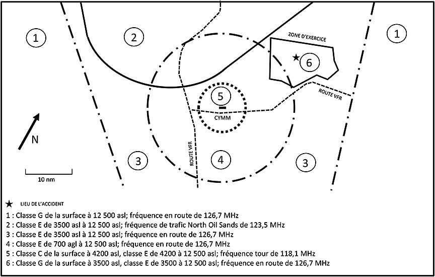 La collision s'est produite à 2800 pieds asl, en un espace aérien non contrôlé de classe G qui se trouve sous un prolongement de la région de contrôle de classe E établie à 3500 pieds asl. Une région de contrôle terminal de classe E (espace aérien contrôlé) entoure CYMM à partir de 700 pieds agl jusqu'à 12 500 pieds asl (figure 4). Le Manuel d'information aéronautique (AIM) stipule ce qui suit :