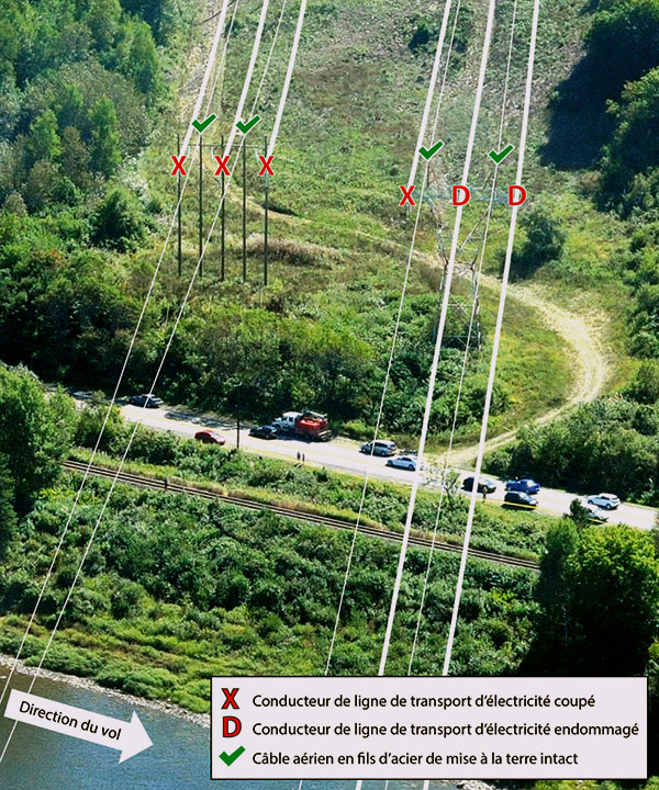L'hélicoptère a coupé 4 conducteurs et a endommagé les 2 autres. Tous les câbles aériens de mise à la terre sont restés intacts (figure 2).