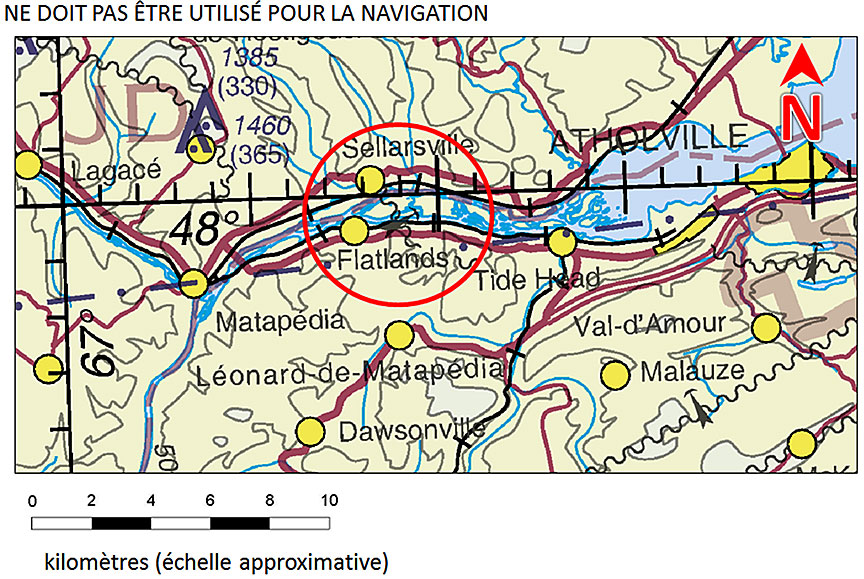 S'agissant des environs de Flatlands, NAV CANADA a aussi indiqué que certains tronçons des lignes de transport d'électricité ne figuraient pas sur la VNC de Chicoutimi parce qu'ils chevauchaient des routes et des lignes ferroviaires avoisinantes aux tracés ou aux directions identiques ou semblables. La position des obstacles et les étiquettes des villes dans la zone ont aussi empêché la représentation de certains tronçons des lignes de transport d'électricité. La raison pour laquelle le petit tronçon des lignes de transport d'électricité qui traverse la rivière Restigouche à Flatlands-île Long est représenté sur la VNC est que ce tronçon est perpendiculaire aux routes et aux lignes ferroviaires dans la zone (autrement dit, il n'y a pas de chevauchement de texte et d'éléments). De plus, comme la ligne traverse la rivière entre 2 localités, elle peut potentiellement servir de repère visuel unique. Le pilote avait en sa possession une VNC de Chicoutimi au cours du vol en cause; cependant, il ne l'a pas consultée au cours du vol. L'enquête n'a pas permis de déterminer si la carte a été consultée avant le départ.
