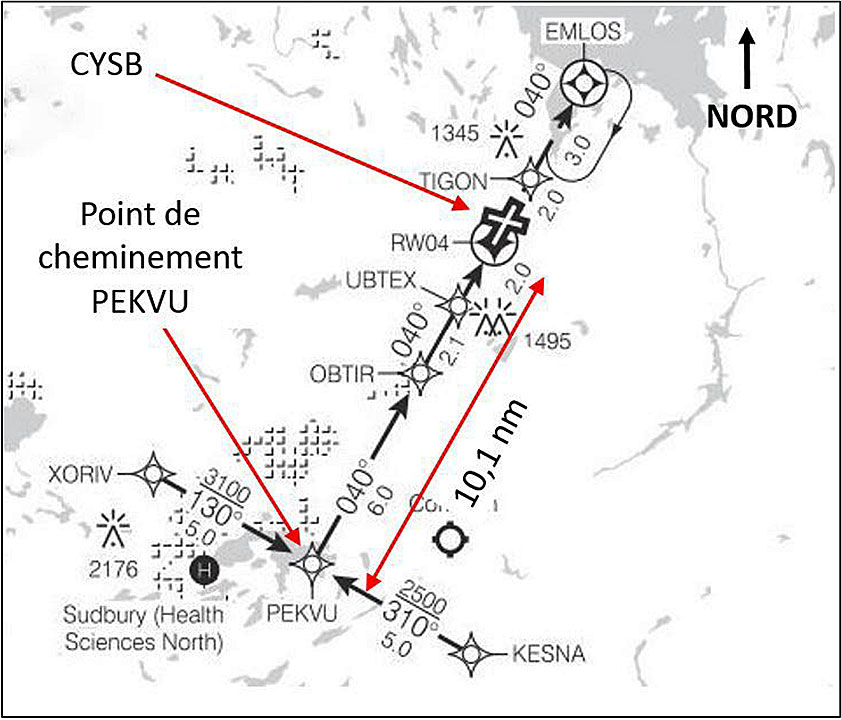 À CYSB, la même surface de piste sert à la fois de piste 04 et de piste 22; le numéro attribué dépend du sens du décollage ou de l'atterrissage (annexe A). La piste 22 était la piste en serviceNote de bas de page 3 lorsque le POE533 s'est approché de CYSB par le sud. Toutefois, le contrôleur de North BayNote de bas de page 4, qui se trouvait au centre de contrôle régional de Toronto, a autorisé le POE533 à franchir directement le point de cheminement d'approche initiale PEKVU. Le point PEKVU se trouve en finale à 10,1 milles marins (nm) en approche par navigation de surface (RNAV)Note de bas de page 5 de la piste 04, et est situé sur le prolongement de l'axe de la piste de départ 22 (figure 1 et annexe B).