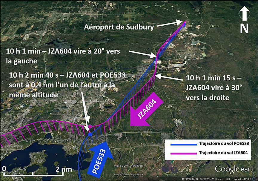 Le 14 octobre 2016, un aéronef de Havilland DHC-8-402 exploité par Porter Airlines Inc. (immatriculé C-GKQA, numéro de série 4357) effectuait le vol 533 (POE533) selon les règles de vol aux instruments de l'aéroport Billy Bishop de Toronto (Ontario) à l'aéroport de Sudbury (Ontario). Un aéronef de Havilland DHC-8-402 exploitée par Jazz Aviation LP (immatriculé C-GXJZ, numéro de série 4523) effectuait le vol 604 (JZA604) selon les règles de vol aux instruments de l'aéroport de Sudbury (Ontario) à l'aéroport international Lester B. Pearson de Toronto (Ontario). Le POE533 se dirigeait vers l'aéroport de Sudbury en provenance du sud et avait été autorisé à effectuer une approche à vue. Le JZA604 avait décollé de l'aéroport de Sudbury conformément aux règles de vol à vue et se dirigeait vers le sud. À 10 h 2 min 21 s, heure avancée de l'Est, alors que les 2 aéronefs se trouvaient à quelque 9,5 milles marins au sud-ouest de l'aéroport de Sudbury et à environ 4000 pieds au-dessus du niveau de la mer, les 2 équipages de conduite ont reçu un avis de résolution de leur système de surveillance du trafic et d'évitement des collisions respectif. Les 2 équipages de conduite ont pris des mesures d'évitement, et les données radar indiquaient que les 2 aéronefs se sont approchés à moins de 0,4 mille marin de distance l'un de l'autre, à la même altitude.