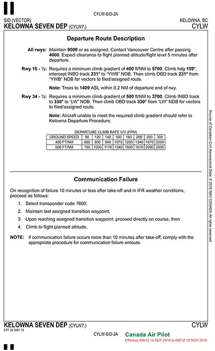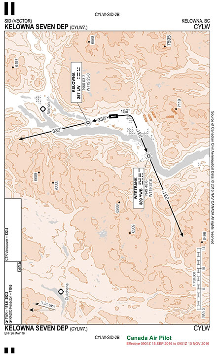 Les instructions SID KELOWNA SEVEN DEP pour la piste 34 indiquaient de monter à 9000 pieds asl, ou à l'altitude assignée par le contrôle de la circulation aérienne (ATC), et de communiquer avec le centre de contrôle régional (ACC) de Vancouver après avoir franchi 4000 pieds asl en montée. L'aéronef devait ensuite monter et suivre le relèvement 330° magnétique (M) en rapprochement jusqu'au radiophare non directionnel Kelowna (LW). À partir de LW, l'aéronef devait monter et suivre le relèvement 330 °M en éloignement pour obtenir les vecteurs vers la route prévue et assignée.