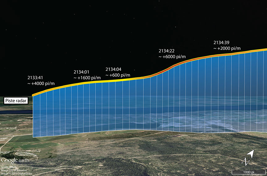 À 21 h 34 min 1 s, au moment où l'aéronef se trouvait à 1,2 nm de la piste, il avait franchi 3800 pieds asl en montée et dévié encore plus vers la droite par rapport à sa route prévue. La vitesse ascensionnelle de l'aéronef a diminué à environ 1600 pi/min, et sa vitesse sol était d'environ 150 nœuds. Peu de temps après, la vitesse ascensionnelle de l'aéronef a diminué à 600 pi/min, son angle de montée a diminué à 2°, et sa vitesse sol avait augmenté à 160 nœuds.