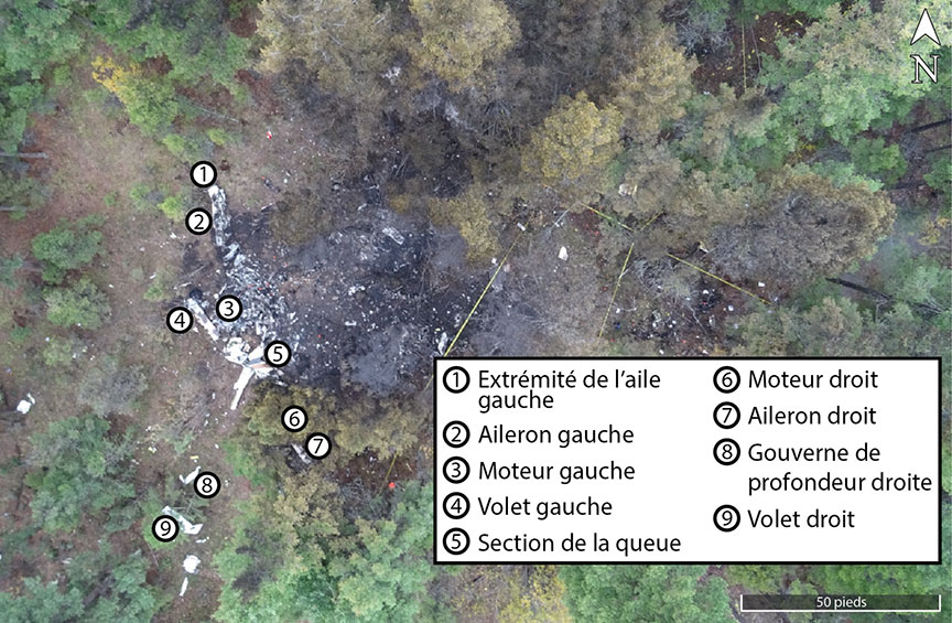 - Étant donné que tous les composants de l'aéronef ont été retrouvés au site de l'épave, les enquêteurs ont établi qu'il n'y avait eu ni désintégration ni séparation de l'aile en vol.