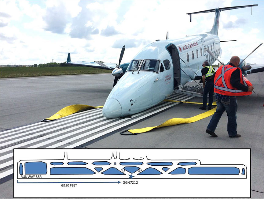 À 7 h 17, le GGN7212 se trouvait en approche finale pour atterrir sur la piste 35R; on est passé de la fréquence tour à la fréquence d'urgence. Quelques minutes plus tard, environ 300 pieds au-dessus du sol (AGL), le commandant de bord a donné aux passagers l'ordre de prendre la position de protection. À 7 h 20, le GGN7212 a posé son train d'atterrissage principal. Le premier officier a mis les 2 hélices en drapeauNote de bas de page 3, a mis les deux leviers de commande de régime du moteur à la position de coupure du carburant, et a tiré sur les 2 poignées coupe-feu en téNote de bas de page 4. Environ 20 secondes plus tard, le nez de l'aéronef s'est posé sur la piste. L'aéronef a glissé sur le nez pendant encore 20 secondes avant de s'immobiliser à 6950 pieds du seuil de piste (figure 2). Les véhicules d'urgence ont rejoint l'aéronef 30 secondes plus tard; en 1 minute, tous les passagers et membres d'équipage avaient évacué l'aéronef.