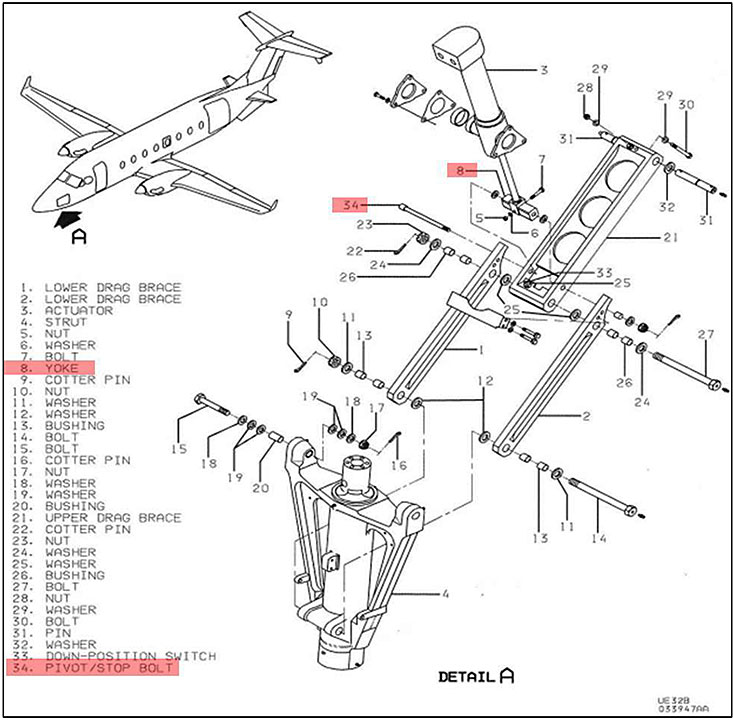 Le manuel d'entretien de l'aéronef intituléBeechcraft Corporation Model 1900D Airliner Maintenance ManualNote de bas de page 5 indique que le 1900D est muni d'un train d'atterrissage tricycle escamotable. Un circuit hydraulique permet de sortir et de rentrer les trains avant et principal. Ce circuit consiste notamment en un vérin situé dans chacun des puits de roue, un distributeur hydraulique situé dans l'aile gauche, et de la tuyauterie hydraulique. Durant la sortie et la rentrée, le vérin du train avant exerce une pression par un étrier en aluminium fixé à l'extrémité du piston actionneur (Figure 3). Cet étrier est fixé aux extrémités des contrefiches supérieure et inférieure; lorsque le piston tire ou pousse l'étrier, ces contrefiches se déplient ou se replient pour sortir ou rentrer le train avant. L'étrier (pièce no 8 dans la figure 3) est fixé et pivote par l'intermédiaire des contrefiches au moyen d'un boulon d'articulation et d'arrêt, numéro de pièce 114-820107-1 (pièce no 34 dans la figure 3).