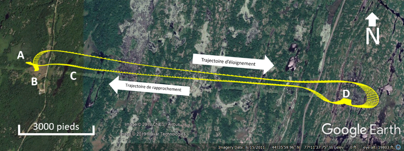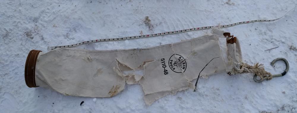 À 11 h 45 min 54 s, le pilote a amorcé la descente pour atterrir. À 11 h 46 min 9 s, l'hélicoptère se trouvait à environ 0,26 NM de la zone de rassemblement. Il se déplaçait à une vitesse de 51 nœuds et était à 230 pieds AGL quand un sac d'équipement en toile vide (désigné ci-après « sac canvasNote de bas de page 6 ») de 4 pieds de long, muni d'un mousqueton, a percuté le rotor de queue et a causé la séparation de l'extrémité d'une de ses pales, y compris la masse d'équilibrage.