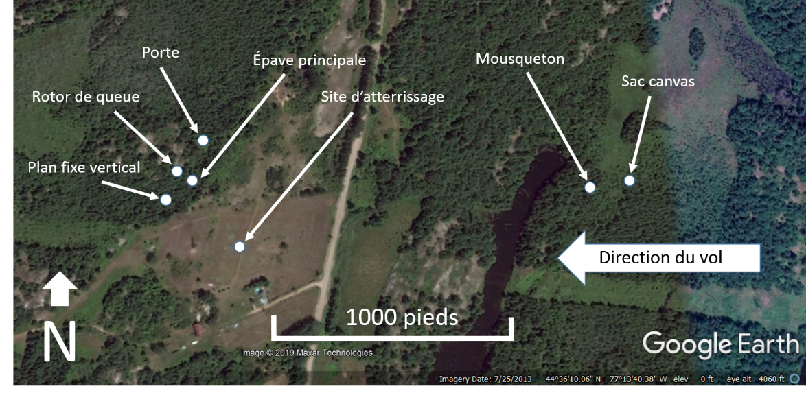 À environ 75 pieds AGL, le rotor de queue, la boîte de transmission arrière et le plan fixe vertical se sont séparés de la poutre de queue. Le pilote a perdu la maîtrise de l'hélicoptère, qui a pris de l'altitude avant de pivoter rapidement vers la gauche et d'amorcer une descente rapide. À 11 h 46 min 42 s, l'hélicoptère a percuté les arbres avoisinants, puis le sol, à environ 400 pieds au nord-ouest du site d'atterrissage prévu (figure 1). Les 3 passagers ont été séparés de l'hélicoptère avant l'impact et ont été mortellement blessés. Le pilote a lui aussi été mortellement blessé.