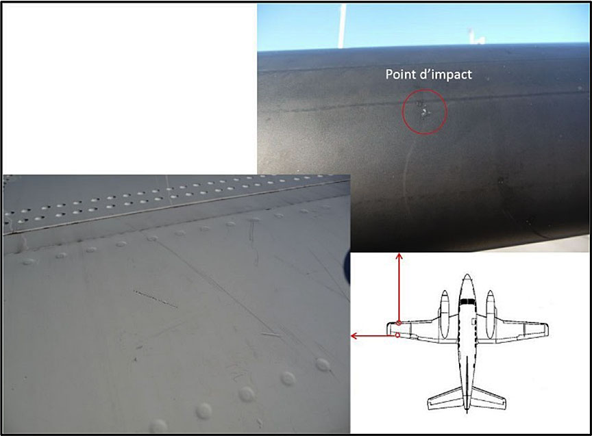 Les dommages sont limités à une petite bosse sur le boudin de dégivrage de l'aile gauche, et des égratignures sur l'extrados de l'aile gauche (figure 2). Les dommages sont mineurs et n'ont pas eu d'impact sur l'état de navigabilité de l'aéronef. Ce dernier a été remis en service le jour même.